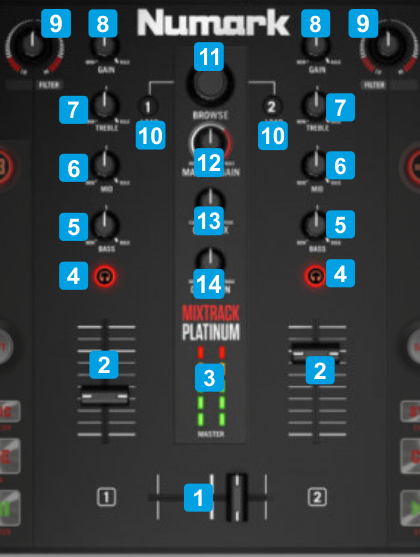 Applies a High/Low Pass Filter to the Left and Right assigned Decks. Filter is not applied if the knob is at the middle (12 o'clock) position