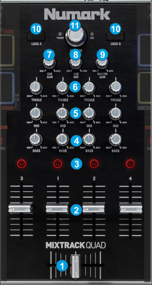 - CROSSFADER. Blends audio between the channels assigned to the left and right side of the crossfader.