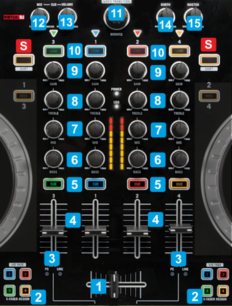 S SHIFTPress this button down to access secondary actions as described in the SHIFT ACTION column1 CROSSFADERBlends audio signals between decks assigned to left and right sides2 X-FADE ASSIGNAssign decks to Left or Right side of the crossfader. When both XFADE buttons for a deck are off, the crossfader will not affect the output of a deck (THRU)Assign decks as Left or Right side of the Video Crossfader. When all Video X-FADE buttons are off, VirtualDJ will use the Left assigned Deck and the Right assigned Deck as Left and Right for the Video crossfader3 PC/LINELed Indicators for Source status of Mixer Channels 3 and 4. Source selection is done via the SOURCE buttons at the front panel of the N44 VOLUMEAdjust the Volume of each mixer channel5 CUE/PFLSend Channel's pre-fader audio signal to the Headphones Channel (for pre-listening)lSelect the pre-fader audio signal of a Deck as the VU-Meters indicator. If none is selected, the VU-meters will indicate the Master Output Level6 BASSAdjust the Low (Bass) Equalizer Band of each mixer channel7 MIDAdjust the Middle Equalizer Band of each mixer channel8 TREBLEAdjust the High (Treble) Equalizer Band of each mixer channel9 GAINAdjust the applied Gain (post-fader) of each mixer channel10 LOADLoad the selected track in Browser to Decks 1 to 4. Hold down for more than 1 second to unload the same deckManually set a Deck as Master Deck (so that all other decks to sync on this one) Hold down for more than 1 second to set Master Deck selection back to Auto mode (VirtualDJ will be automatically selecting the Master Deck depending on which deck is out on Master Output Leds above the LOAD buttons will indicate the selected Master Deck and will blink if the Manual Master Deck selection mode is selected.11 BROWSEScroll through files or folders Push to toggle focus between the Folders and the Songs ListSelect a Video Transition Push to set focus to the Folders List. If focus is in Folders list, push to expand/collapse sub-folders12 CUE MIXSet Master Output audio signal when in maximum MIX position. Send the audio signal from decks that have the CUE/PFL enabled to the Headphones channel when in minimum CUE position. Blends audio signal from Master and Decks in all other middle positions 13 CUE VOLAdjust the Output Volume of the Headphones channel 14 BOOTH VOLAdjust the Volume of the Booth Output (connection at the rear)15 MASTER VOLAdjust the Volume of the Master Output (connection at the rear)