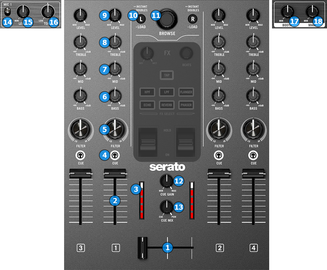 1 CROSSFADERBlends audio signal from the decks assigned as left and right sides of the crossfader.2 VOLUMEAdjust the VolumeStarts playback when the fader is moved from the minimum (low) position to a different one and stops to Cue position when moved from any position to the minimum (Fader Start/Stop)3 VU METERSThe LED array indicates the pre-fader Level Output4 CUESend the pre-fader audio signal of the Deck to the Headphones channel (for pre-listening)5 FILTERApply the selected Color FX (Filter by default). When at center position, the Color FX is not applied. The Color FX can be selected from the VirtualDJ GUI.6 BASSAdjust the Low (Bass) Equalizer Band7 MIDAdjust the Mid (Middle) Equalizer Band8 TREBLEAdjust the High (Treble) Equalizer Band9 LEVELAdjust the pre-fader Level (Gain)10 LOADLoads the selected track from the Browser to the Left/Right Deck. Double/fast press to clone the track of Left/Right Deck to the other Deck.Unloads the track from the same Left/Right Deck 11 BROWSEScrolls through Folders or Tracks Push to toggle focus between Folders and Songs ListSet focus to Folders list. If focus is in Folders list, expand collapse sub-folders 12 CUE GAINAdjust the Level of the Headphones Output Channel13 CUE MIXSend audio signal from the Master Output to the Headphones channel when in MIX (right) position. Send audio signal from the Decks that have their PFL enabled to the Headphones channel when in CUE (left) position. Blends the above audio signals when in all other positions.14 MIC1/LINE AUX SWITCH* Select whether you want to control the MIC1 input, or the AUX input.15 MIC1/LINE LEVEL* Adjust the Volume of the Mic 1 or the AUX Input (connections at the rear panel)16 MIC1/LINE TONEApply a simple single band EQ on the MIC1/LINE Input17 BOOTHAdjust the Volume of the Booth Output18 MASTERAdjust the Volume of the Master Output