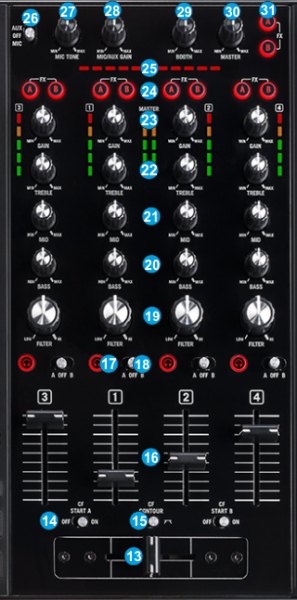 - FX ASSIGN. These buttons are used to clone the effects from one deck to the other. E.g if the FX A button on the channel 4 is pressed, the Effects from the left deck (A) will be cloned to the deck 2.
