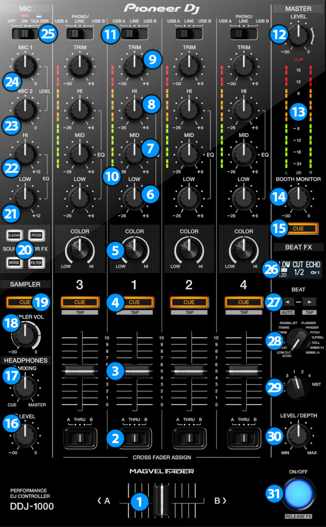 - MIC 2 VOLUME. Adjust the Volume Level of MIC2 Input of the DDJ-1000 (Hardware operation)