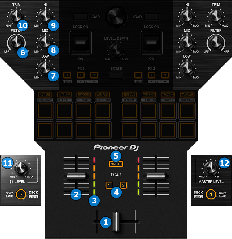 TIP: You can hold down SHIFT button while operating the volume channel faders or the crossfader to automatically start/stop the decks playback (fader start)
