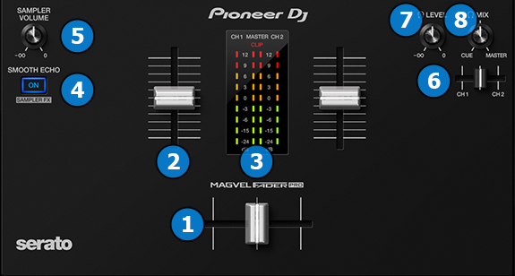 4. SMOOTH ECHO FX. When enabled, a smooth echo audio effect will be audible when the volume of the channel or the crossfader goes to zero.