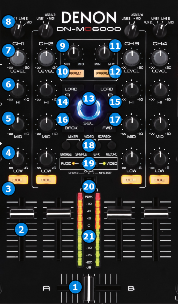 1. CROSSFADER: Blends audio (or video, or both) between the channels assigned to the left and right side of the crossfader.