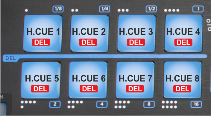 When the HOTCUE/AUTOLOOP mode button (38) is unlit, the 8 Pads offer HotCue functions.