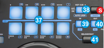 When the HOTCUE/AUTOLOOP mode button (38) is lit, the 8 Pads offer Auto Loop and Loop Roll functions.