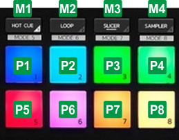 M1 HOTCUESet Pads to Hotcues mode (led will be turned on solid)Set Pads to KeyCue mode (led will be flashing)M2 ROLLSet Pads to Roll mode (led will be turned on solid)Set Pads to FX mode (led will be flashing)M3 SLICERSet Pads to Slicer mode (led will be turned on solid)Set Pads to Scratch mode (led will be flashing)M4 SAMPLERSet Pads to Sampler mode (led will be turned on solid)Set the 8 Pads to BeatJump mode (led will be flashing)HOTCUE MODE