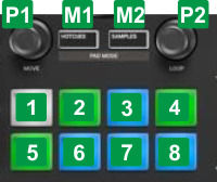 M1 HOTCUEPress this button to assign the 8 Pads to Hotcues mode (led will be turned on solid). If in Hotcues, press again to set Pads to Loop Roll mode (led will be flashing fast)Press to set the 8 Pads to CueLoop mode (led will be flashing slowly)M2 SAMPLESPress this button to assign the 8 Pads to Sampler mode (led will be turned on solid). If in Sampler, press again to set Pads to BeatJump mode (led will be flashing fast)Press to set the 8 Pads to KeyCue mode (led will be flashing slowly)