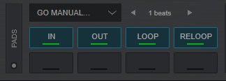 Use the PAD MODE button until the 3rd Led (MANUAL) is lit to set the Pads to Manual Loop mode. The special GO Manual Loop page will be then selected and displayed in the VirtualDJ GUI