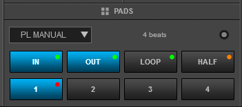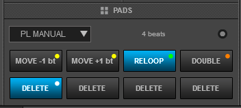 When loop is enabled, sets the Jogwheel to Loop Out Adjust modeMoves Loop forward by 1 beatP3 PAD 3Enable/disable a Loop of the selected size in beats. Exits Loop when enabledEnables and jumps to the last triggered loop (reloop) P4 PAD 4Halves the size of the loopDoubles the size of the loop AUTO LOOP MODE