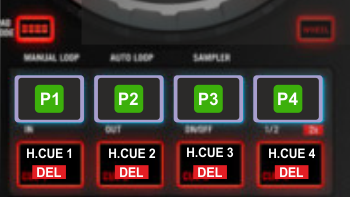 P5 CUE 1Assigns or jumps (if assigned) to Hot Cue 1Deletes Hot Cue 1 P6 CUE 2Assigns or jumps (if assigned) to Hot Cue 2Deletes Hot Cue 2 P7 CUE 3Assigns or jumps (if assigned) to Hot Cue 3Deletes Hot Cue 3 P8 CUE 4Assigns or jumps (if assigned) to Hot Cue 4Deletes Hot Cue 4 MANUAL LOOP MODE