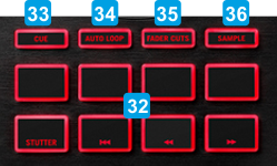 32 PADS 1-8Performance Pads offering different functionality depending on the selected modeDifferent functionality depending on the selected mode33 CUESets Pads to Hotcue modeSets Pads to Cue-Loop mode (led will blink) 34 AUTO LOOPSets Pads to Loop modeSets Pads to Saved Loops mode (led will blink) 35 FADER CUTSSets Pads to Fader Cuts mode. A hardware/internal mode in which Pads perform a on-beat Crossfader movement pattern, simulating Scratch36 SAMPLESets Pads to Sampler modeSets Pads to Key Cue mode (led will blink) Front & Rear