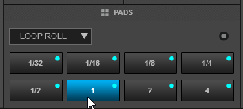 While the Auto Loop mode is selected, press the same AUTO mode button again to set the PADs to Loop Roll mode (the led of the AUTO/ROLL button will become blue). The Loop Roll page will be then selected and displayed in the Pads section of the default skin of VirtualDJ