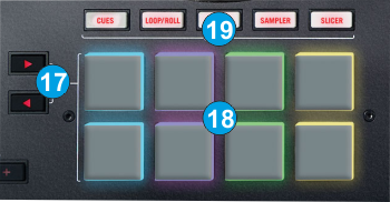 Pads (18) offer 10 different modes, depending on the PAD MODE SEL buttons (19). Press the same PAD MODE button again to access the additional mode (the LED will blink as an indication).