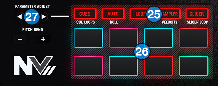 Pads (26) offer 10 different modes, depending on the PAD MODE SEL buttons (25). Press the same PAD MODE button again to access the additional mode (the LED will blink as an indication).