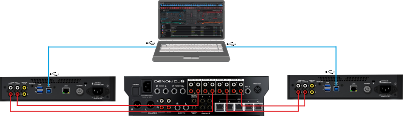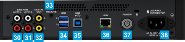 30 LINE OUT - LAYER AUse standard RCA cables to connect this output to your DJ mixer and send out the audio signal from Layer A. Denon This output is used only in Standalone mode.31 LINE OUT - LAYER BUse standard RCA cables to connect this output to your DJ mixer and send out the audio signal from Layer B. This output is used only in Standalone mode.32 DIGITAL OUTUse standard digital coaxial cables to connect these 24-bit/96 KHz outputs to devices and mixers such as the Denon DJ X1800/X1850 Prime mixers.33 REMOTEUse a standard remote start cable to connect this input to the remote-start output of your mixer (if available). While connected to a remote-start-compatible mixer, moving the crossfader toward the side that corresponds to this SC6000 Prime (or raising the channel fader for its channel) will automatically start the track on the currently selected layer.34 USB HUB Connect standard USB drives to these USB ports. When you select one of those USB drives as a source (press the Source button), you can use the display to select and load tracks on your USB drives. There is also a similar USB port on the front panel. Note that devices connected to these ports will not be available as Computer devices, if the SC6000 is in Standalone mode35 USBUse the provided USB cable (included) to connect this USB port to an available USB port on your computer. This connection sends and receives MIDI messages to and from the computer when the SC6000 is set to Computer mode 36 LINKUse the included networking cable to connect this port to another SC6000 Prime or to your Denon DJ X1800/X1850 Prime mixer. Each networked SC6000 Prime can share track databases, timing and BPM information, and other track data over this connection. This connection is not used in Computer mode.37 POWER BUTTONPress this button to power SC6000 Prime on or off. Power on SC6000 Prime only after you have connected all of your input devices and before you power on your amplifiers and loudspeakers. Power off your amplifiers and loudspeakers before powering off SC6000 Prime. Press and hold this button for 10 seconds to reset SC6000 Prime. 38 POWER INPUT Use the included power cable to connect this input to a power outlet. SC6000 Prime has a protection circuit to keep it powered on for 10 seconds after an unexpected power loss. Within 10 seconds after losing power (you will see a message in the display), reconnect it to your power source to return to normal operation. Screen