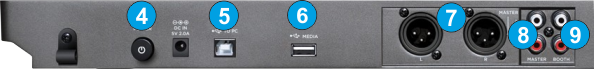 - BOOTH OUTPUT (RCA): Use standard RCA cables to connect this output to a booth monitoring system. The level of this output is controlled by the BOOTH knob on the top panel.
