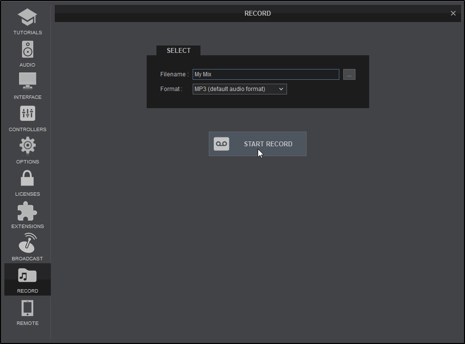 The Record section allows recording of both your audio and video mixes. By default VirtualDJ records the Master output. If an External Audio Setup is defined or a different recording source needs to be used a