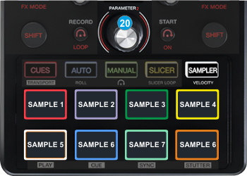 The functionality of the PARAMETER encoder (20) is the same as in the Sampler mode.