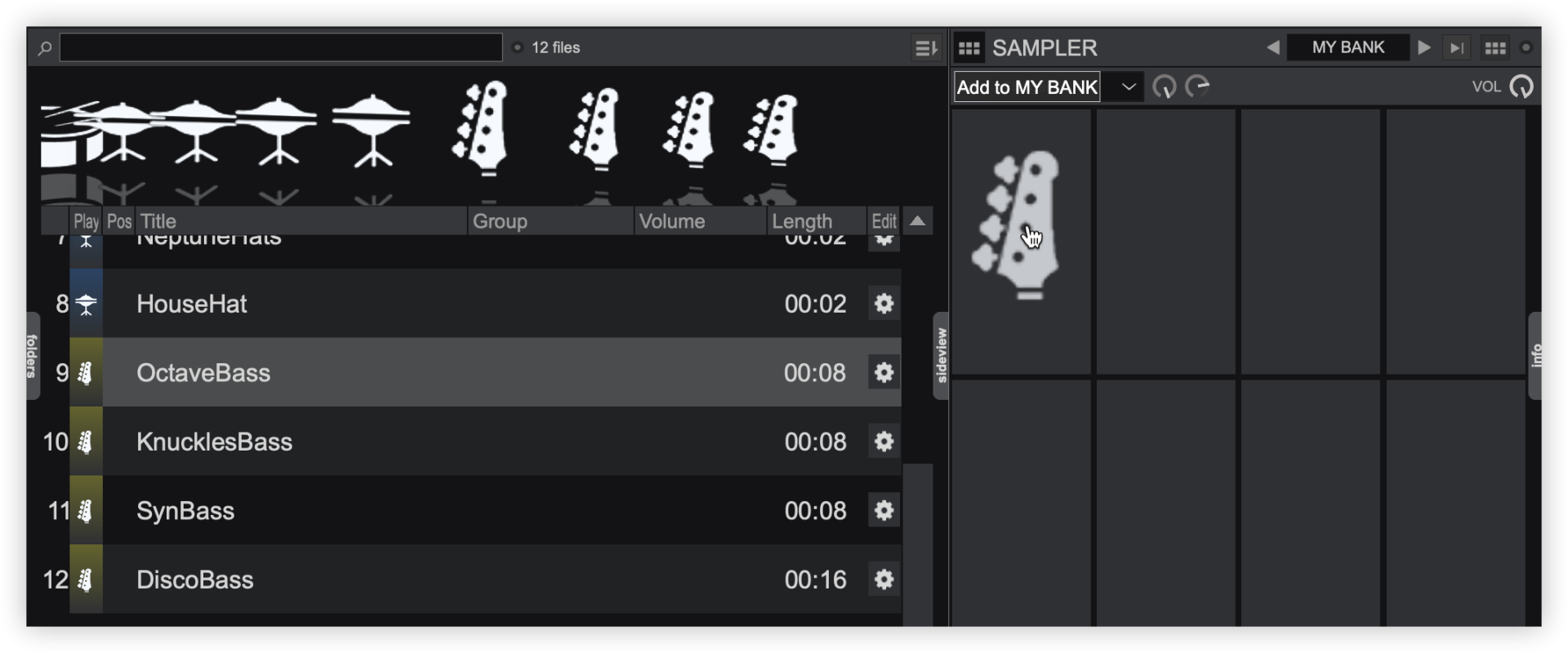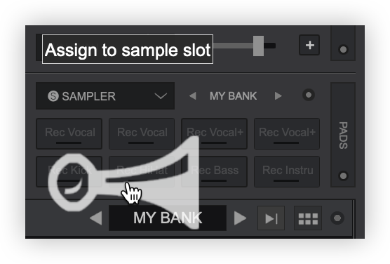 You can then pre-listen to your Sample and choose to add it to a Sampler Bank by dragging and dropping the sample to the Sampler sideview or a sampler folder in the Folder List.
