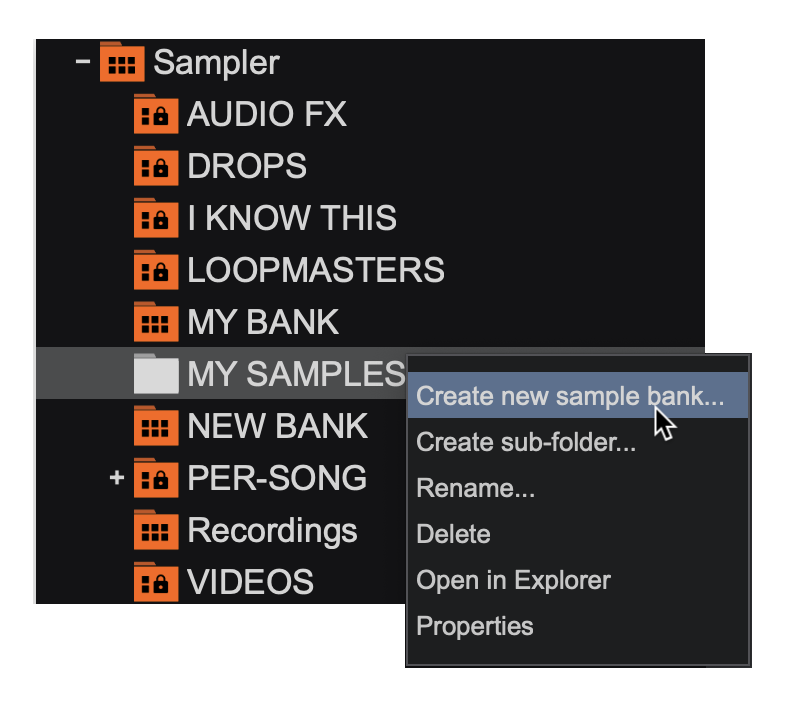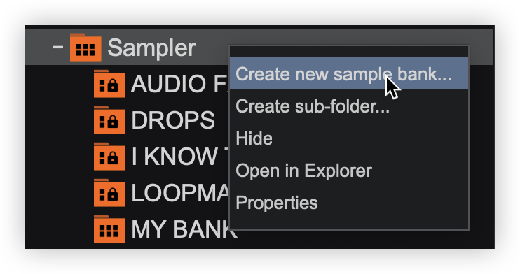 Right-clicking on the sub-folder will give the options to Create new sample bank..., Create sub-folder..., Rename..., Delete, Open in Explorer, and Properties. If creating a new sample bank or sub-folder it will be nested in the sub-folder it was created in. - Sample banks can be moved into sub-folders by dragging the bank onto the subfolder icon.