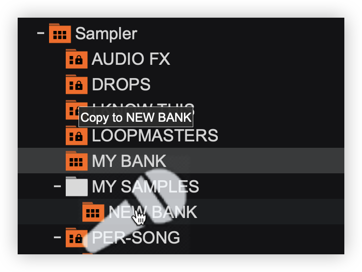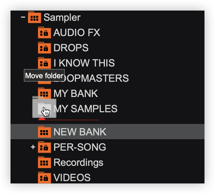 - Once the bank is moved to the sub-folder it will now appear nested in that folder. To remove it from a specific sub-folder, the bank can be dragged to another sub-folder or dragged to the main sampler folder.