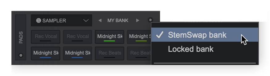 Note: When a bank is set to StemSwap, it will always play on the trigger deck (even if the sample is not a stem loop that can swap), and will be affected by the deck's volume and crossfader.