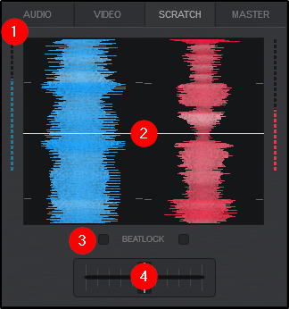 The SCRATCH Mixer offers vertically scrolling waveforms and a center panel with specific features. Mixing controls, display information and buttons are offered depending on the layout chosen.