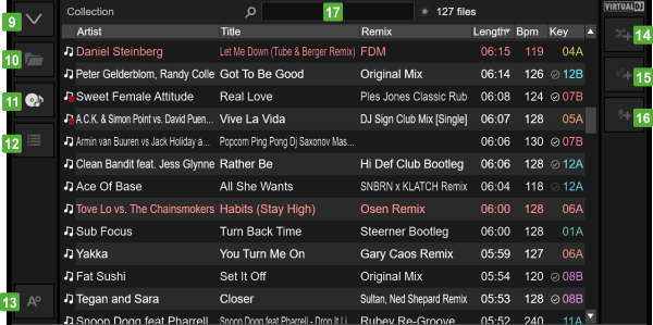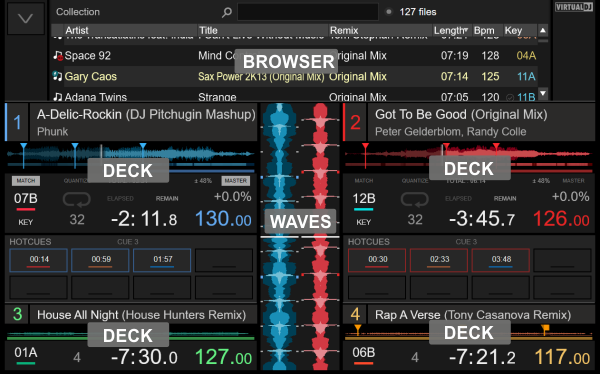 The Waves area will display the Vertical Scratch waves of the Left and Right assigned Deck. The waves can be hidden, locked (from accidental touch) or displayed in different colors and types, depending on the settings that can be found in the WAVES tab of SETTINGS view