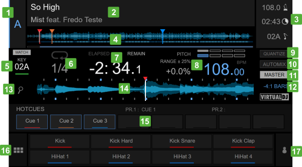 Tap the BPM value area to to get Beat-grid Adjust controls at the Deck Info area.9Quantize. Tap to enable/disable.10Automix. Tap to enable/disable Automix on this deck.11Master Deck indicator12Beat-grid information in Bars : Beats13Wave Zoom mode. Tap to enable (icon will blink) and then use the BROWSE encoder to zoom the waveform in/out. Tap again to disable the Zoom mode.14Waveform.Can be locked (from accidental touch) or displayed in different colors and types, depending on the settings that can be found in the WAVES tab of SETTINGS view15Performance Pads. Displays the name of the currently selected Pads page, the values of its Parameters (if available) and information about the Pads functionality of the selected page.16Show/hide Sampler Bank and Sampler mode controls.17Show/hide Custom Buttons panel 18Select to view the Folders List.19Select to view the Songs List.20Select to view the Sideview. Tap again to cycle through the available lists of Sideview (Automix, Sidelist, Karaoke, Sampler and Shortcuts.21Browser Info. Tap to show/hide Info panel on the right side of the Browser for the browsed track. See VirtualDJ Manual on how to customize what this panel will display22Text Options. Tap to show/hide buttons to enlarge/reduce the Font size and 3 levels of Line padding23Tap to get the On-Screen Keyboard and search for tracks in your LibrarySETTINGS