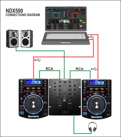 - Use a pair of RCA cables to connect each NDX Output to an Input Channel of a mixer. Any analogue or digital mixer can be used.