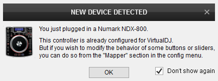 A detection window will appear when the unit is first connected with VirtualDJ.