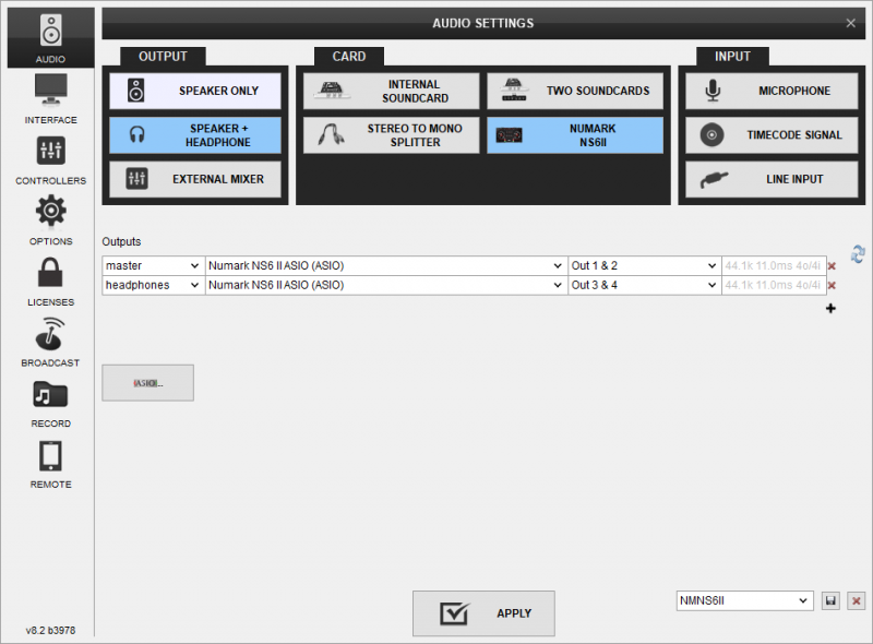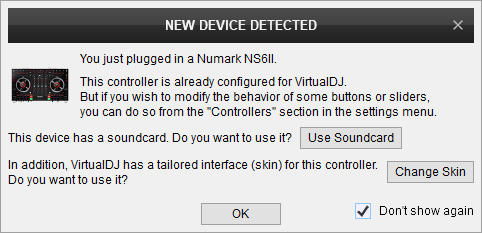 Click on the "Use Soundcard" button in order VirtualDJ to apply the pre-defined audio configuration (speakers need to be connected to the rear side of the unit in this case).