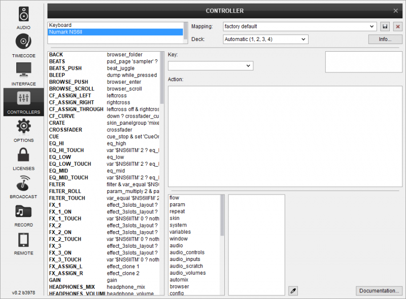 The unit should be visible in the CONTROLLERS tab of Config and the “factory default” available/selected from the Mappings drop-down list. The factory default Mapping offers the functions described in this Manual, however those can be adjusted to your needs via VDJ Script actions.