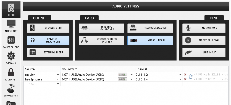 Click on the Use Soundcard in order VirtualDJ to apply the pre-defined audio setup with the built-in sound card of the NS7II (speakers need to be connected to the rear side of the unit in this case)