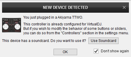 A detection window will appear when the unit is first connected with VirtualDJ, verifying proper detection.