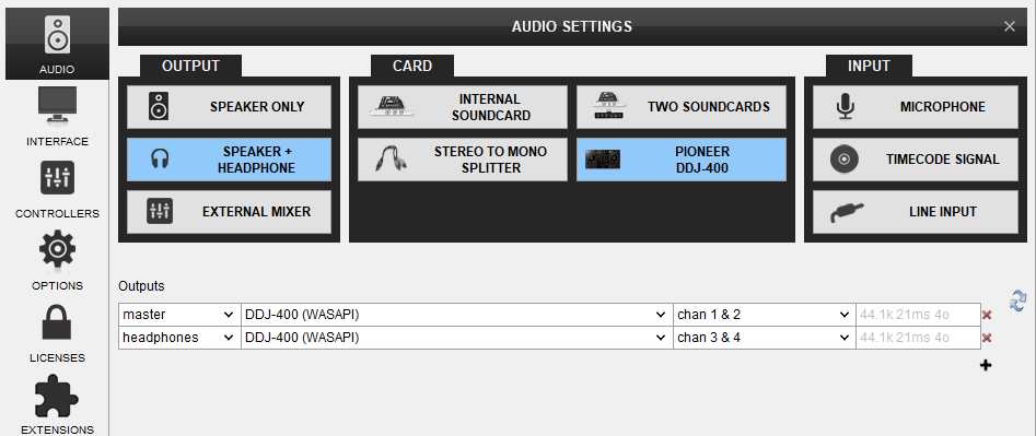 Click on the "Use Soundcard" button if speakers are connected to the Master Output of the DDJ-400. You can still change that from Settings->AUDIO tab.