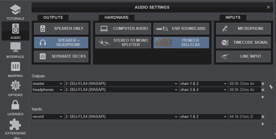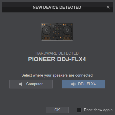 Click on the "DDJ-FLX4" button if speakers are connected to the Master Output of the DDJ-FLX4. You can still change that from Settings->AUDIO tab.