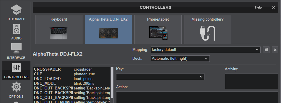 The device should be visible in the MAPPING tab of Config and the “factory default” available/selected from the Mappings drop-down list. The factory default Mapping offers the functions described in this Manual, however those can be adjusted to your needs via VDJ Script actions.
