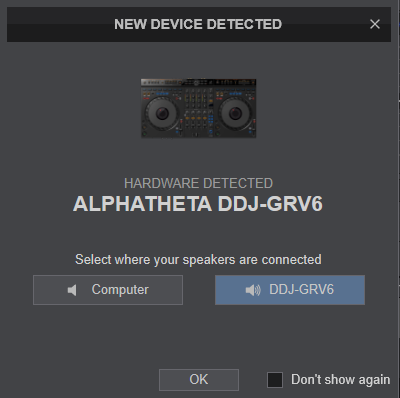 Click on the "DDJ-GRV6" button if speakers are connected to the Master Output of the DDJ-GRV6. You can still change that from Settings->AUDIO tab.