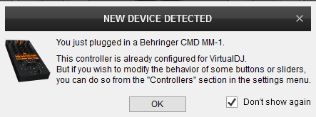 A detection window will appear when the unit is first connected with VirtualDJ, verifying proper connection