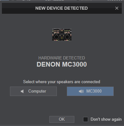 Click on the MC3000 button in order VirtualDJ to apply the pre-defined audio configuration using the built-in sound-card of the unit. Speakers need to be connected to the rear panel of the unit in this case.