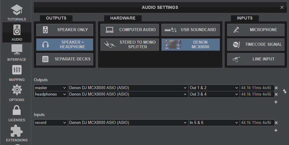 Click on the MCX8000 button in order VirtualDJ to apply the pre-defined audio configuration (speakers need to be connected to the rear side of the unit in this case)