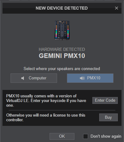 A Pro Infinity, a Plus Controller or a Pro Subscription License is required to fully use the Gemini PMX10. Without any of the above Licenses, the controller will operate for 10 minutes each time you restart VirtualDJ.