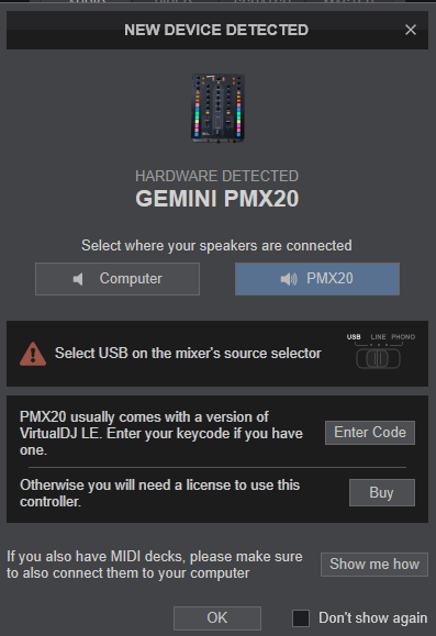 A Pro Infinity or a Pro Subscription License is required to fully use the Gemini PMX20. Without any of the above Licenses, the controller will operate for 10 minutes each time you restart VirtualDJ.