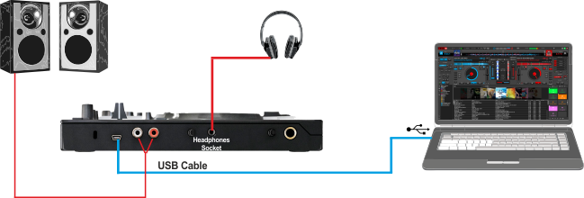 Connect the SLATE4 with your computer using the provided USB cable. Connect your Headphones to the Headphones socket and your amplifier/amplified speakers to the Master Out socket at the side panel of the SLATE4 using an RCA cable.