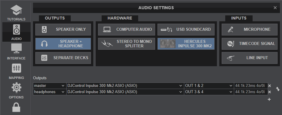 Click on the DJControl Inpulse 300 MK2 button to allow VirtualDJ to auto-create the pre-defined audio configuration.