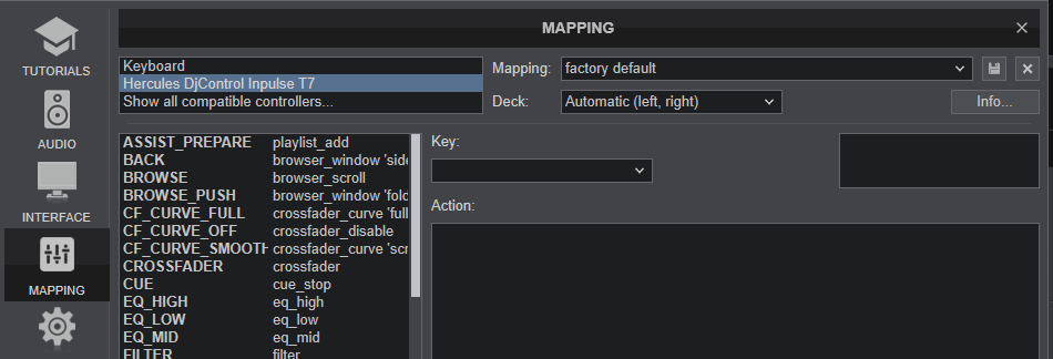 The device should be visible in the MAPPING tab of VirtualDJ Settings and the “factory default” available/selected from the Mappings drop-down list. The factory default Mapping offers the functions described in this Manual, however those can be adjusted to your needs via VDJ Script actions.