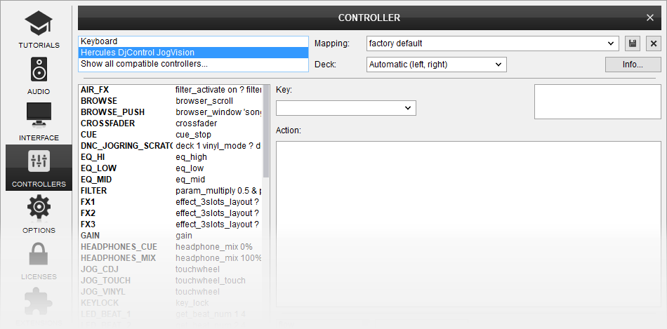 The unit should be visible in the CONTROLLERS tab of Config and the “factory default” available/selected from the Mappings drop-down list. The factory default Mapping offers the functions described in this Manual, however those can be adjusted to your needs via VDJ Script actions.
